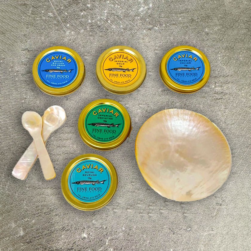6. This set also includes stunning caviar accessories such as a caviar plate and two mother-of-pearl caviar spoons. These perfect utensils to savour every delicate bite of caviar, ensuring the purest taste.